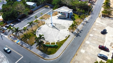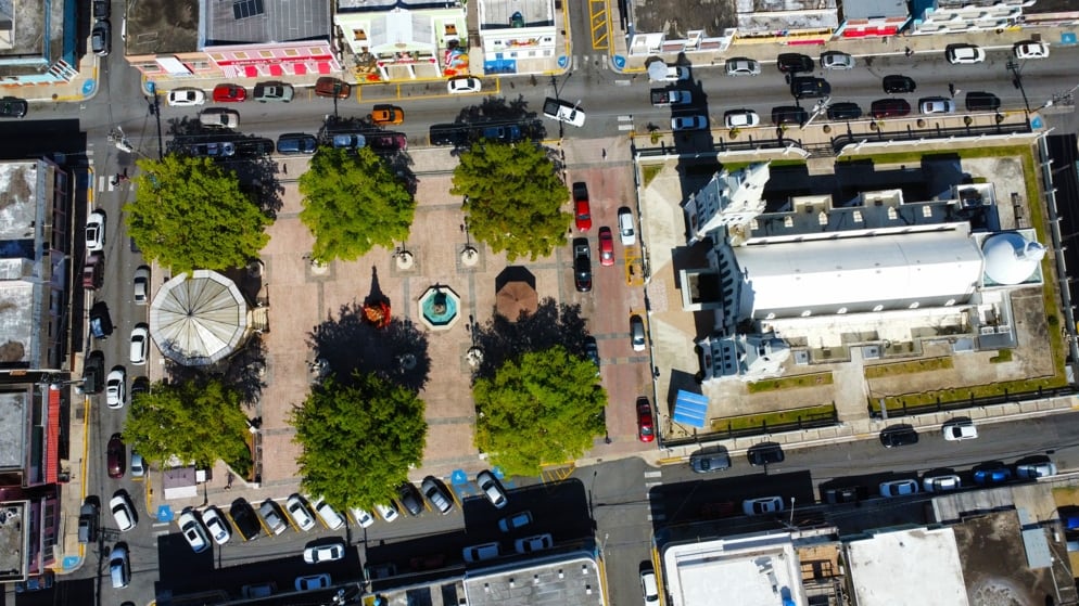 An aerial view of Plaza Cristóbal Colón with the parish church of Saint Francis of Assisi on the eastern side to the right. The Alcaldía is at the top, above the statue of Christopher Columbus.