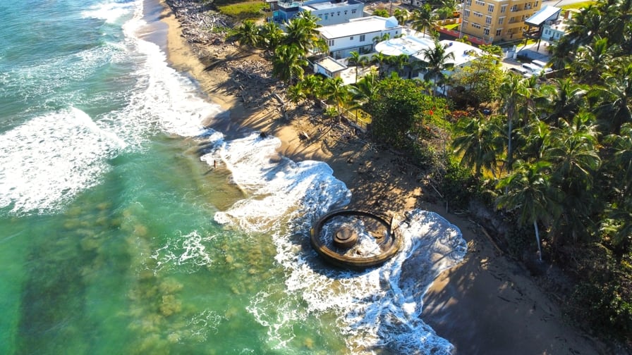Cannons Beach (Playa Cañones) is named for the remains of World War II cannons which were installed here to help defend the coast, the entrance to the Caribbean Sea, the route to the Panama Canal and the air base just to North in Aguadilla. Originally a set of 6 guns were installed on Panama gun mounts, of which the bases of three can still be found on or near this beach.