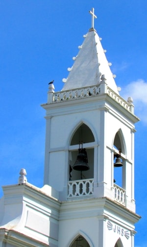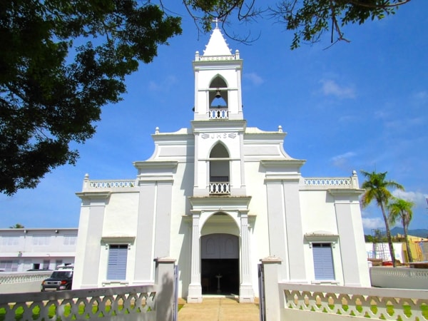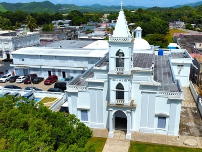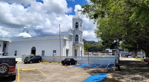 Located within, and occupying a large part of, the plaza de recreo, Nuestra Señora del Rosario (Our Lady or the Rosary) is the parish church of Naguabo. While the church lies on an East-West axis, it's placement on the western side of the plaza with its entrance facing into the plaza means it is not oriented as traditionally seen in Puerto Rican churches.