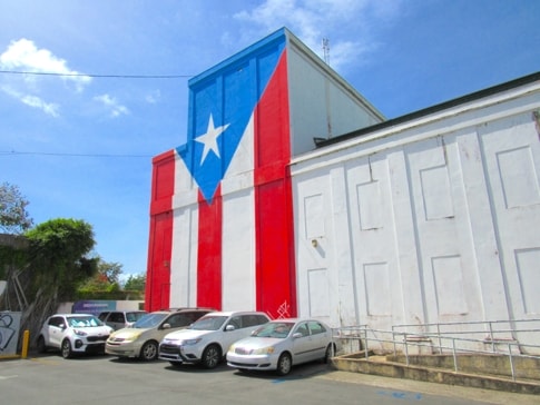Easily seen from the Plaza de Recreo, painted on a side wall of the municpal theatre towards the back, is Naguabo's Bandera de Hector.