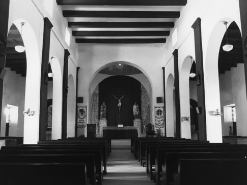 Inside, the current choir loft is a newer addition, while at the front a low concrete latice wall encloses a garden area with a path to the front entrance.